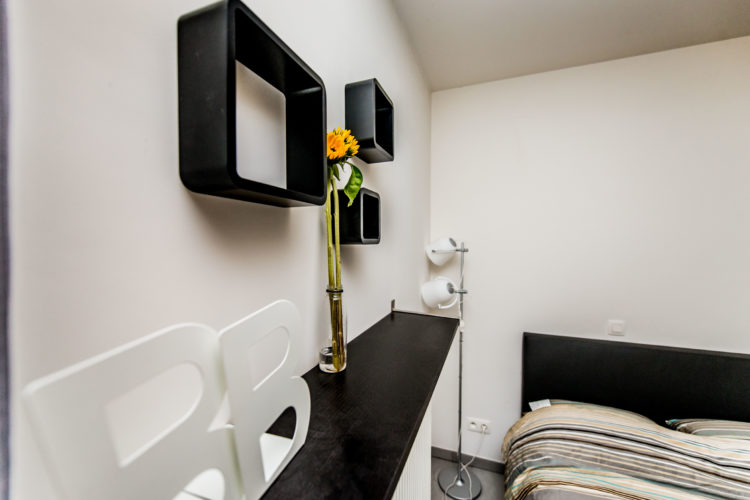 Deze ruime studio is stijlvol ingericht en is voorzien van alle comfort. Hij is gelegen op het gelijkvloers met een zuid oriëntatie en rechtstreekse toegang tot het terras. De leefruimte is 18m² groot en is voorzien van een compacte, praktische keuken. De ruime badkamer van 5 m² bevat een grote inloopdouche, hangtoilet en wasbak. Een comfortabele boxspring verzekert een goede nachtrust en de screenlines in de ramen met hoogrendementsglas zorgen voor de nodige privacy en houden als zonnewering in de zomer de warmte buiten.